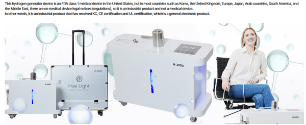 This hydrogen generator device is an FDA class 1 medical device in the United States, but in most countries such as Korea, the United Kingdom, Europe, Japan, Arab countries, South America, and the Middle East, there are no medical device legal notices (regulations), so it is an industrial product and not a medical device.