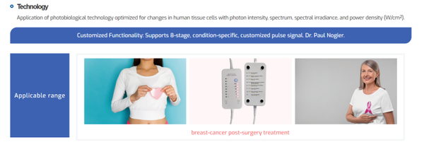 - Application of photobiological technology optimized for changes in human tissue cells with photon intensity, spectrum, spectral irradiance, and power density (W/cm²).