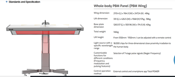 Photon intensity, spectrum, spectral irradiance, and power density (W/cm²). A product enriched with the effects and technology of photobiological techniques applied to whole-body PBM therapy.